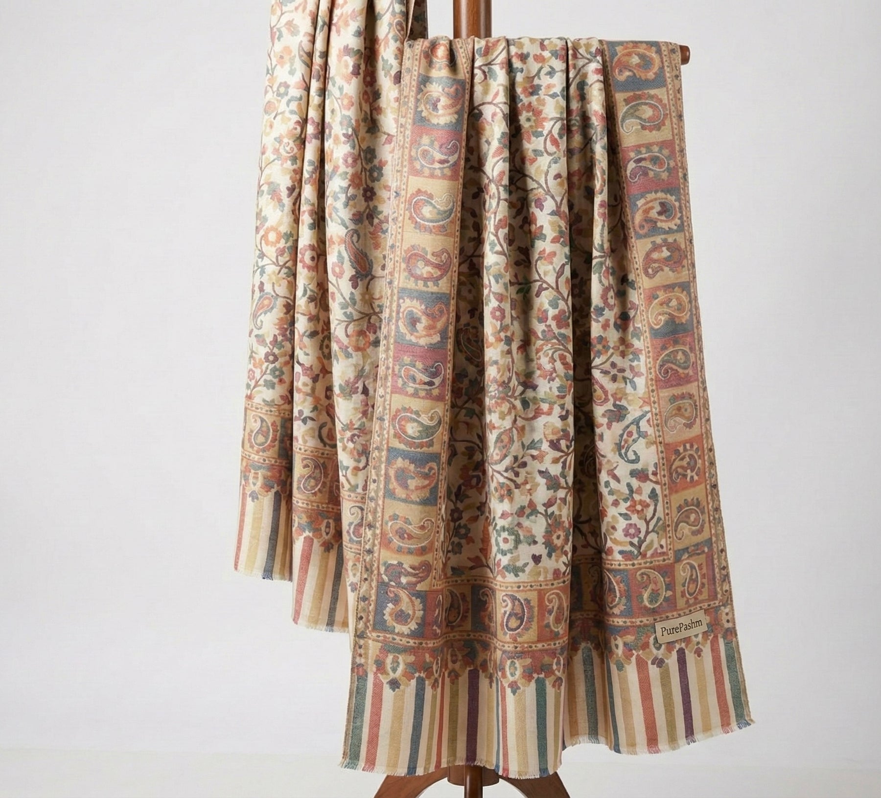Each pattern is formed with precision using wooden kanis, resulting in a shawl that looks equally refined on both sides. The intricate motifs and vibrant color combinations reflect the heritage of Kashmiri craftsmanship while remaining elegant and timeless.