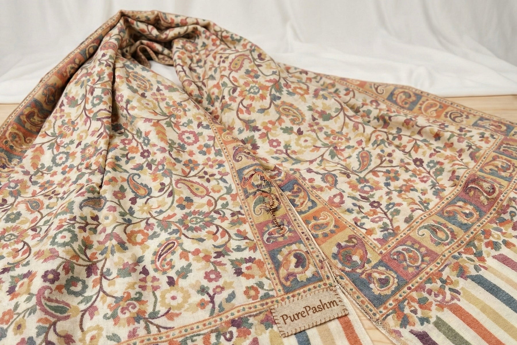This authentic Kashmiri Kani shawl is handwoven on a traditional handloom using the classic Kani weaving technique. The beautiful multicolor design is created during weaving, not embroidered or printed, which gives the shawl its rich detail and long-lasting finish.
